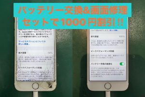 只今バッテリーと液晶の交換をして頂くと1000円の割引がございます。