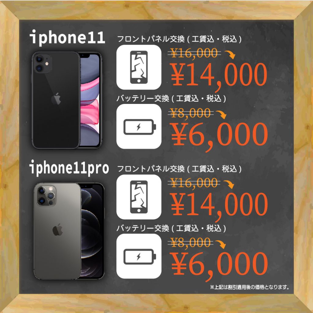 | iPhone11proガラス割れ | ¥9,800(パーツ代・工賃込み) |