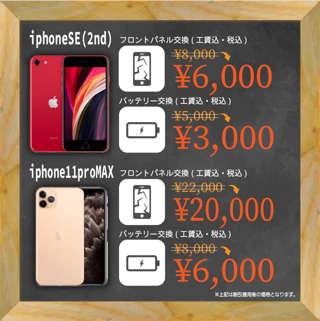 | iPhoneSE2液晶+ガラス割れ | ¥6,800((パーツ代・工賃込み) |