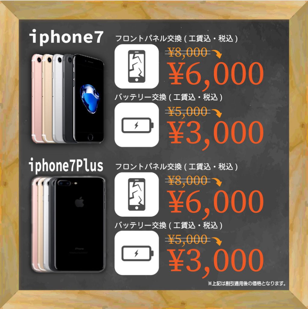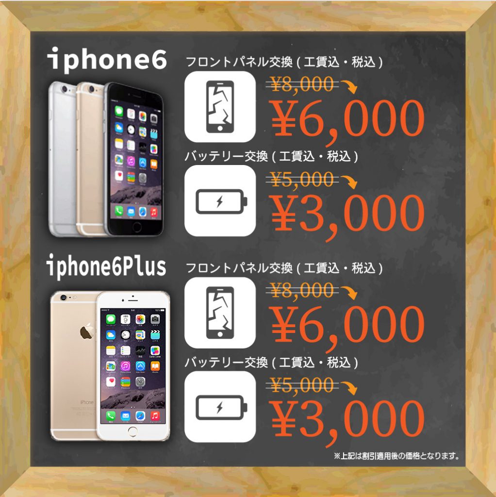 | iPhone6,6s,7,7s,8液晶+ガラス割れ | ¥6,800(パーツ代・工賃込み) |