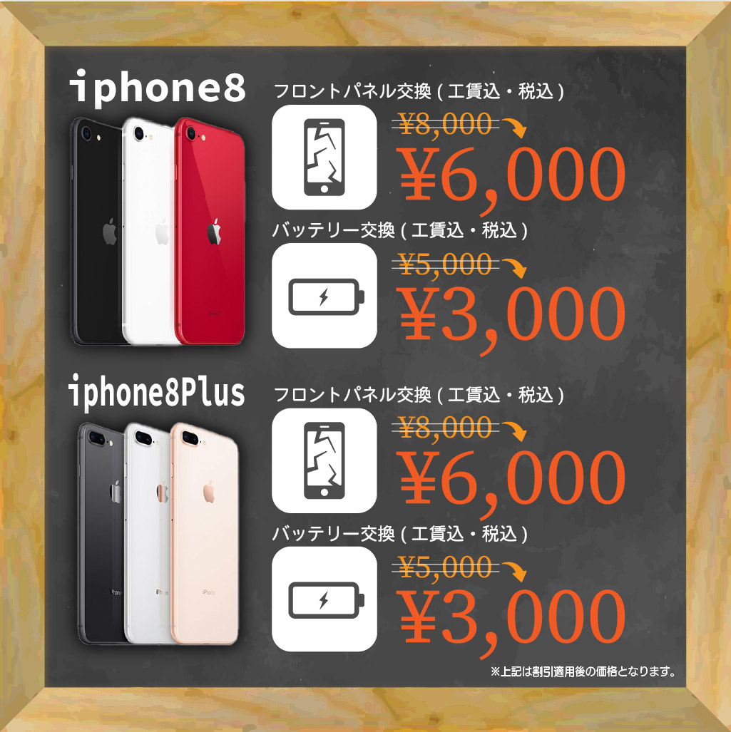 | iPhone8Plus液晶+ガラス割れ | ¥6,800(税・工賃込み) |
