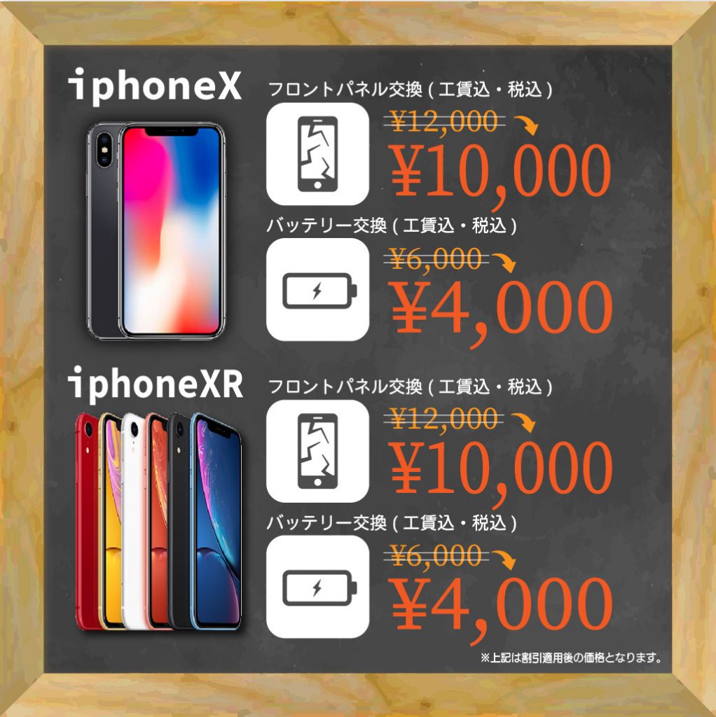 | iPhoneⅩR液晶+ガラス割れ | ¥9,800(パーツ代・工賃込み) |