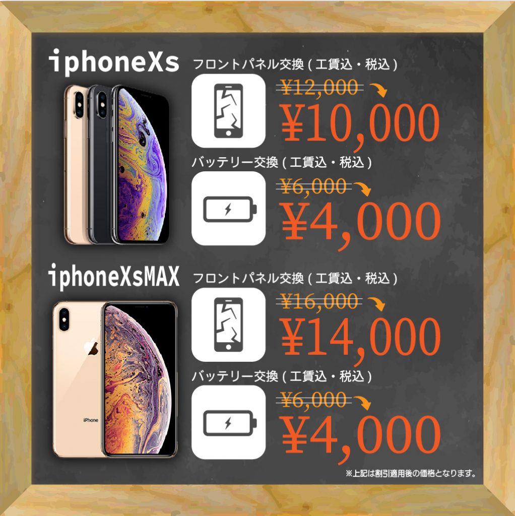 | iPhoneⅩs max液晶+ガラス割れ | ¥12,800(パーツ代・工賃込み) |